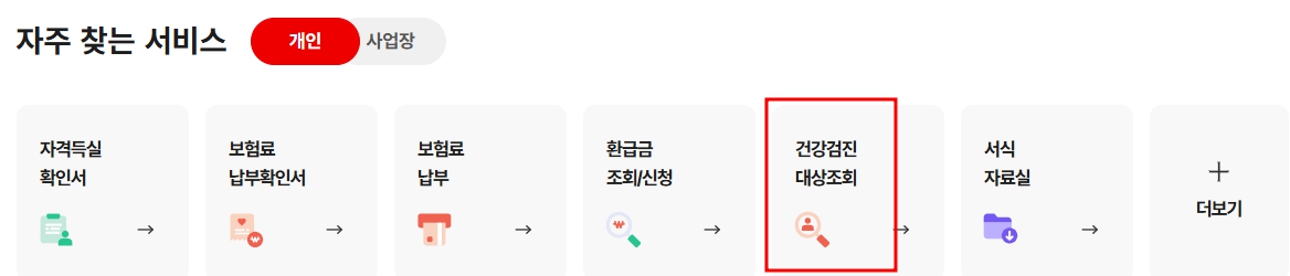 자주 찾는 서비스에서 건강검진 대상조회를 누르세요