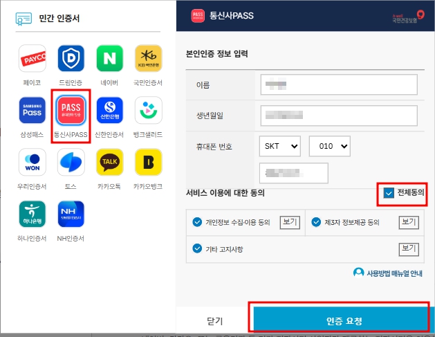 본인인증 정보 입력을 모두 입력하고 전체동의 하신 후 인증요청 눌러주시면 휴대폰으로 인증문자가 날아옵니다.